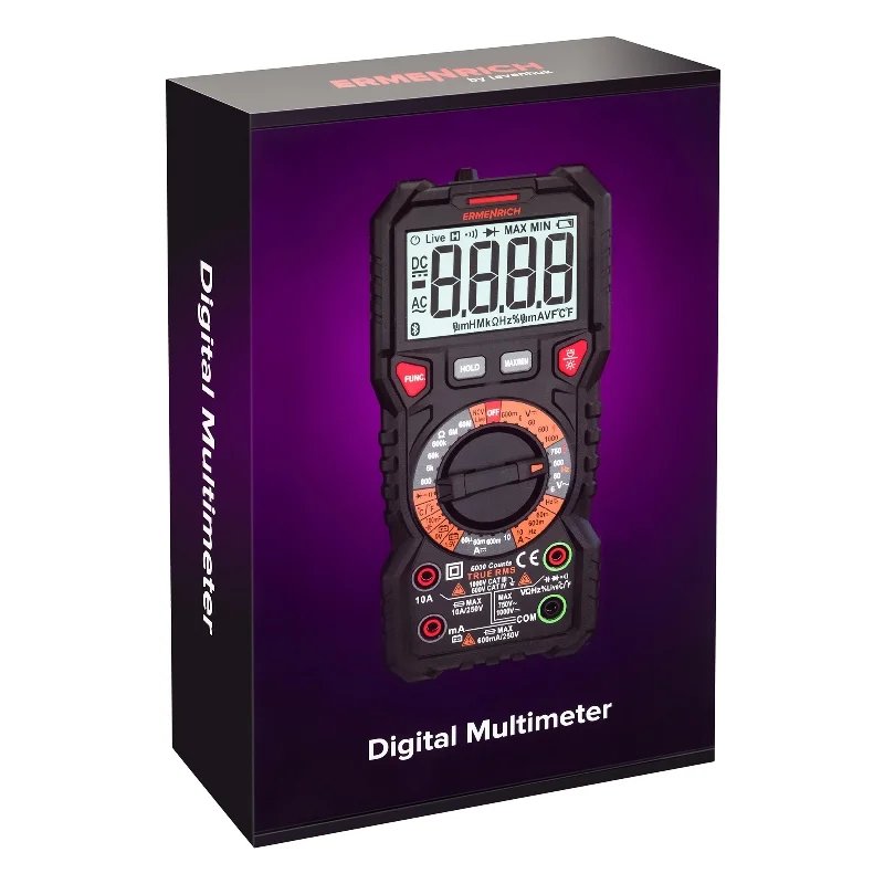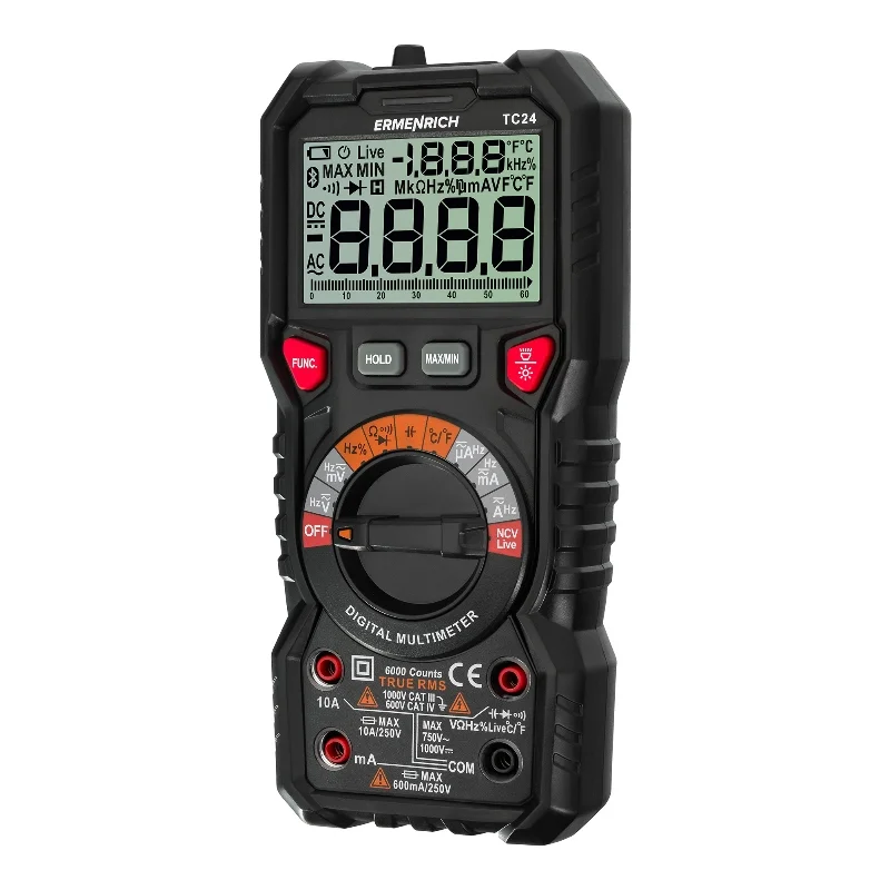 Цифровой мультиметр Ermenrich Zing TC24 представляет собой современный измерительный прибор, сочетающий в себе широкие функциональные возможности, высокую точность и продуманную эргономику. Благодаря автоматическому выбору предела измерений устройство особенно удобно для пользователей, которым важна скорость работы и минимизация риска ошибки при настройке диапазонов. Мультиметр способен заменить несколько отдельных приборов, поскольку включает в себя функции амперметра, омметра, вольтметра, измерителя емкости, частотомера, термопары и инструмента для оценки рабочего цикла.